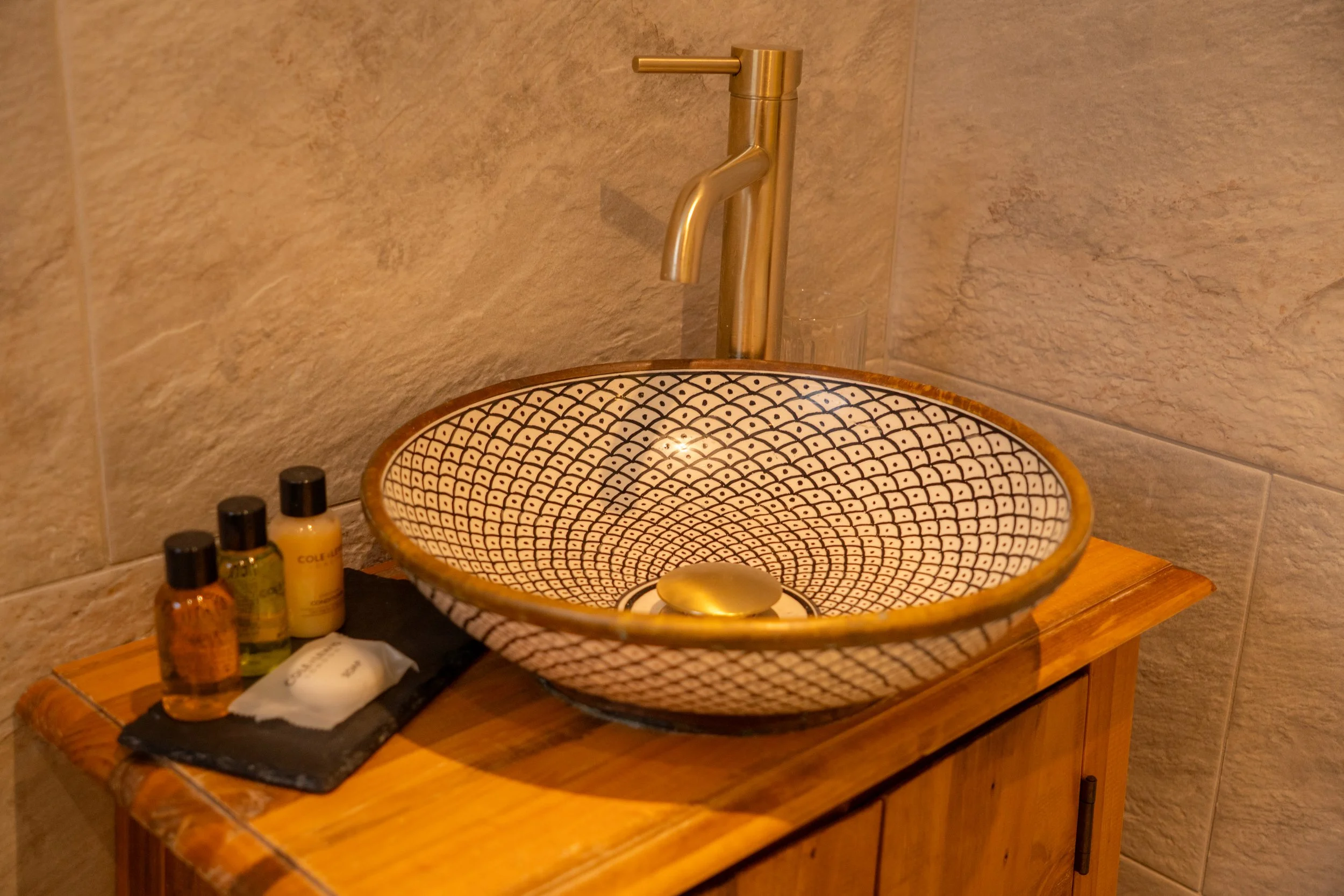 The bathroom, though small, was designed to feel like a little luxury. Gold and stone tiles, a Moroccan-style sink, and warm lighting make it a space to linger in rather than rush through. It is one of those rooms that quietly surprises people, elegant, practical, and just indulgent enough.
