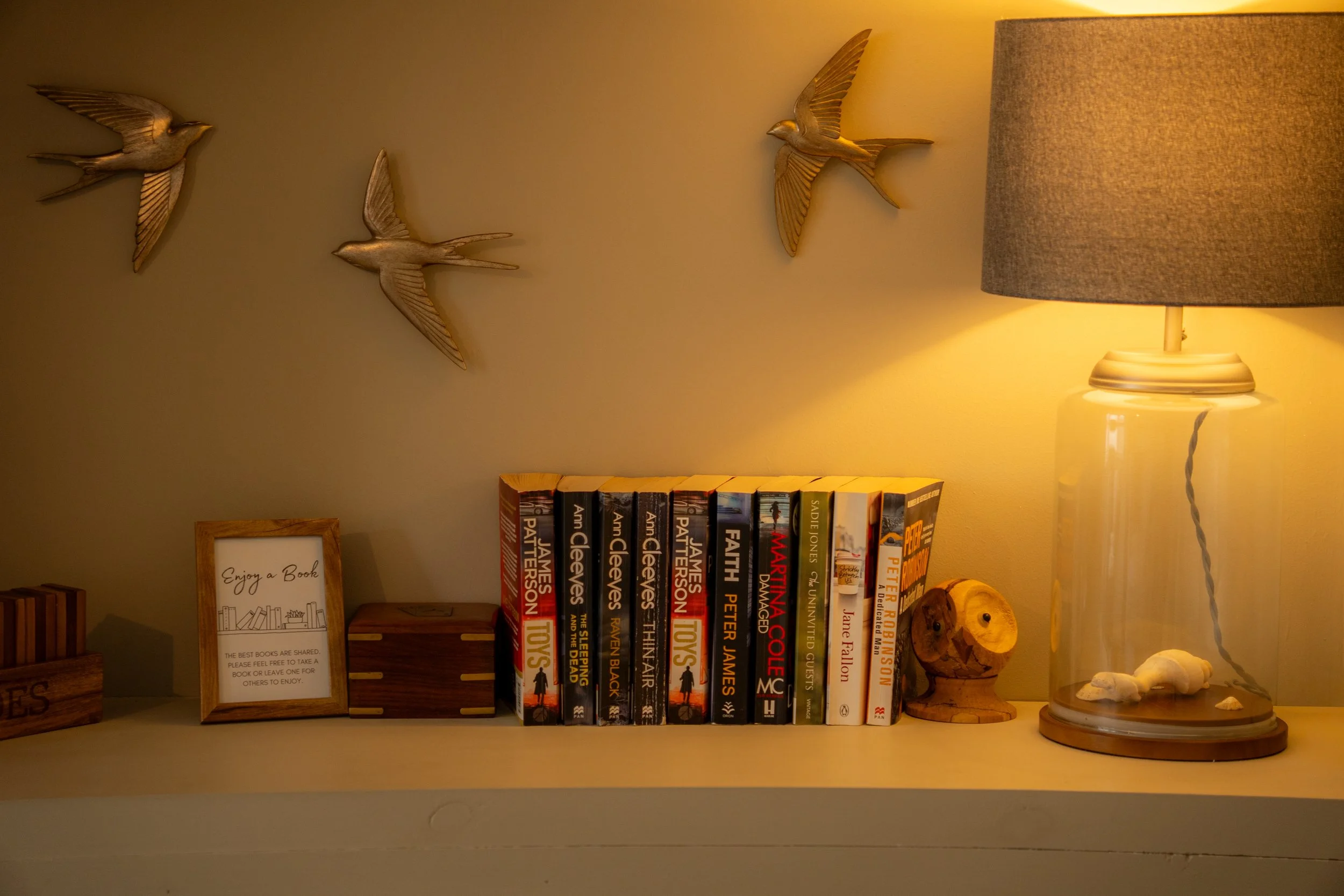 Each room has its own quiet theme. In the living room, a soft dusk tone wraps around the walls, creating a space that feels both light and grounding. The herons in the prints are a small tribute to the ones that linger along the coast, while glass lamps filled with collected shells give a gentle reminder of the shoreline. The sofas were a risk. The man at DFS thought I was mad to choose such a pale, plush fabric for a holiday let, but I wanted them to feel luxurious and lived in. This is a space for sinking into, for reading, watching saved-up films, and letting time slow down.