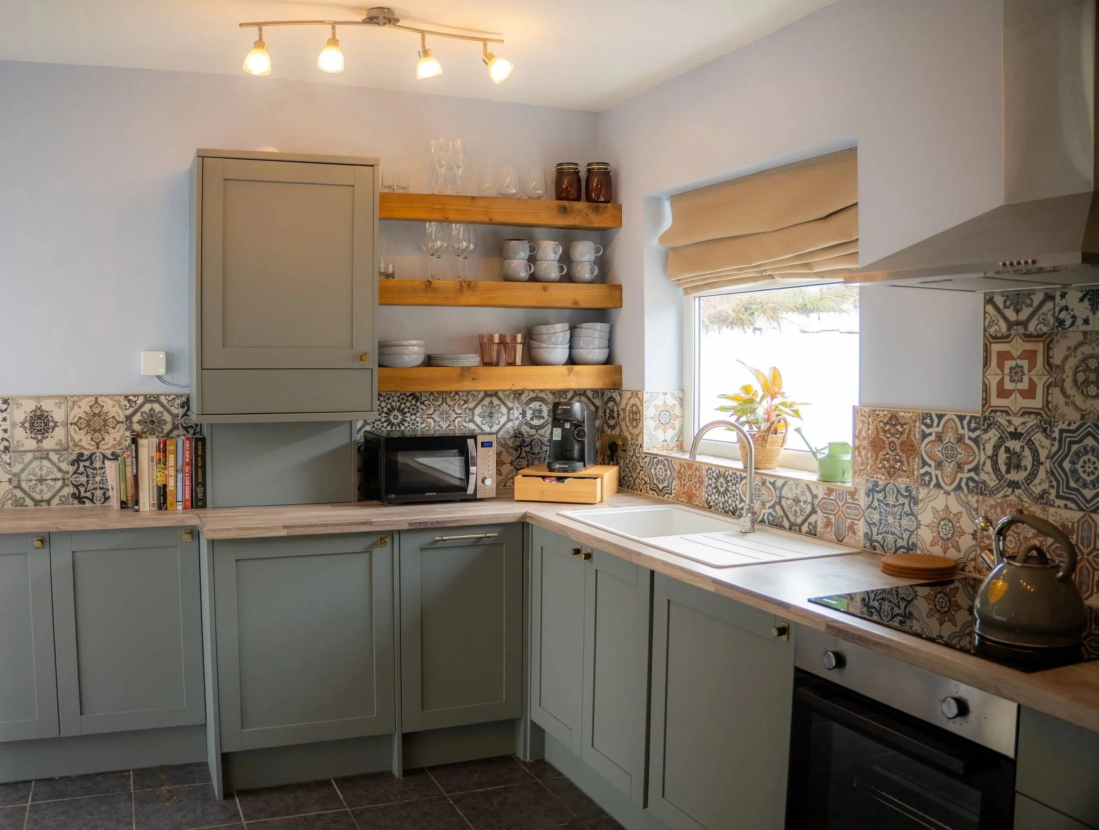 The palette is calm and consistent throughout. In the bedroom, a Victorian green brings depth to a light-filled space, wrapping the room in a cosy warmth that feels timeless. The living room stays soft and airy, with pastel tones, simple lines, and small beach-inspired ornaments that remind you where you are without ever shouting about it.